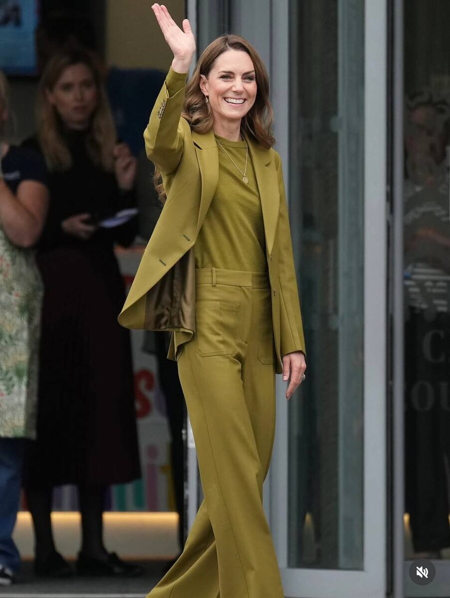 Свежий выход принцессы Кэтрин в оливковом костюме от Виктории Бекхэм на встрече с волонтерами из благотворительной организации