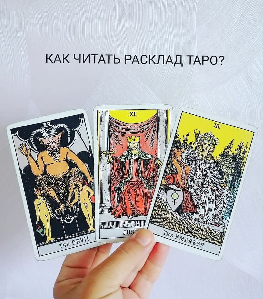 Недавно попался такой интересный случай. Выпали Дьявол, Справедливость, Императрица. Здесь простенький пример: читаем слева направо, дословно. Дьявол = проблемы. Справедливость = закон. Императрица = женщина. Что получилось? Проблемы с законом из-за женщины. Расклад из трёх карт описал ситуацию, когда у мужчины возникли проблемы с законом из-за женщины (женщина его подставила).