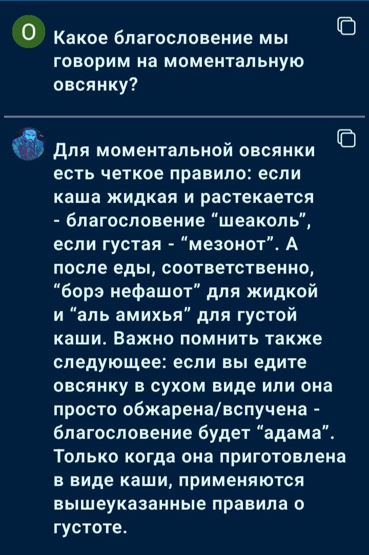 Для моментальной овсянки есть четкое правило: если каша жидкая и растекается - благословение "шеаколь", если густая - "мезонот". А после еды, соответственно, "борэ нефашот" для жидкой и "аль амихья" для густой каши. Важно помнить также следующее: если вы едите овсянку в сухом виде или она просто обжарена/вспучена - благословение будет "адама". Только когда она приготовлена в виде каши, применяются вышеуказанные правила о густоте. 📲 Скачайте приложение "AI RABBI от BeEzrat HaShem Inc.", чтобы всегда иметь под рукой ответы на вопросы Галахи! Ваш личный AIRabbi в кармане! 👉 https://www.AIRabbi.org