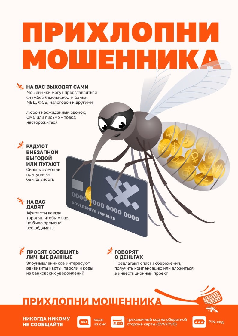 🦟🦟🦟🦟🦟🦟🦟🦟🦟 Так называется новая информационная кампания, которую запустили на Ямале. Её цель — повысить цифровую грамотность северян и уберечь от интернет-мошенников. Любопытно, но факт: только за 9 месяцев зарегистрировано почти 1000 киберхищений на 455 млн рублей! Памятки с советами по защите от обмана уже размещены в общественных местах Ямала. А слоган «Прихлопни мошенника!» — призыв сохранять бдительность и не поддаваться на провокации. Проект создан Координационным центром ЯНАО совместно с МВД России по ЯНАО и ЦБ РФ по Тюменской области. Организаторы планируют выпустить серию материалов. #прихлопнимошенника 📸 Ситуационный центр ЯНАО ❤️ Импульс Севера | Подписаться в MAX