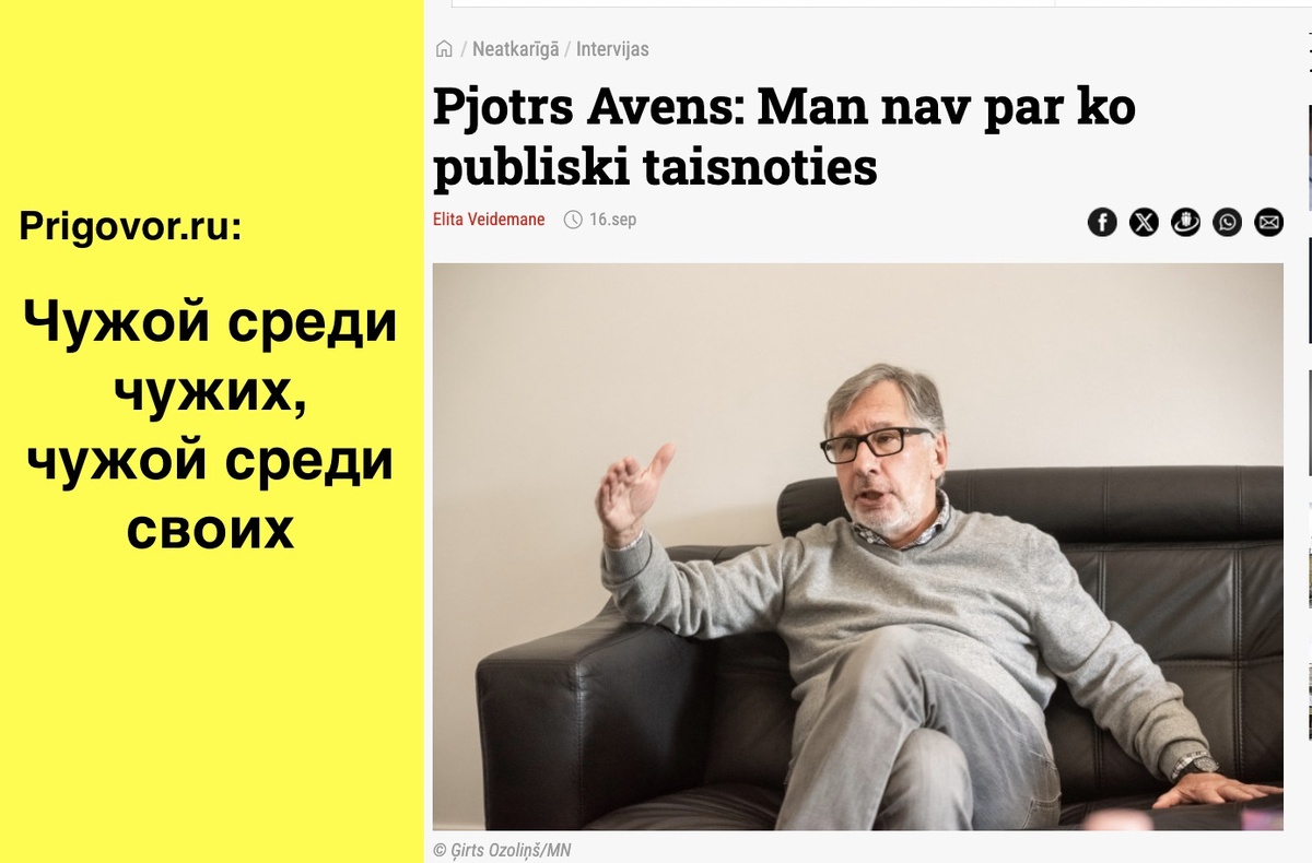 В отличие от своего партнёра, 70-летний экс-министр Авен продолжает ползать на коленях перед прибалтами — Авен уже потерял нечто большее, чем деньги. Типичный путь предателя, ставшего изгоем и в своей стране, и в чужой.