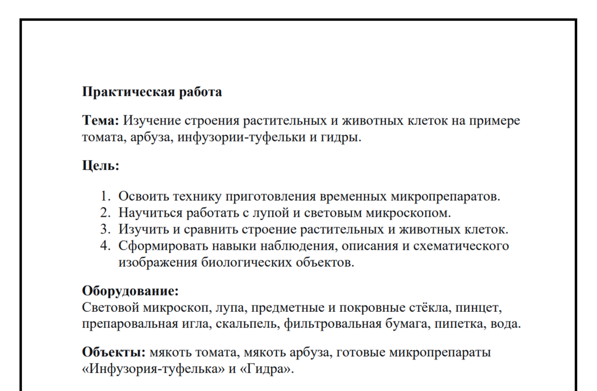 Тип и роль практической работы Данный документ представляет собой учебно-методический материал для проведения лабораторной (практической) работы по биологии в 5 классе. Тип работы: Лабораторная работа: Это основной тип работы, направленный на формирование практических умений и навыков. Учащиеся не просто пассивно получают знания, а активно действуют: проводят наблюдения, работают с оборудованием (микроскоп, лупа), готовят препараты, анализируют и фиксируют результаты. Исследовательская работа (в элементарной форме): Работа имеет черты мини-исследования, так как ученики проводят сравнительный анализ строения разных типов клеток и самостоятельно приходят к выводам на основе собственных наблюдений. Комбинированная работа: Она сочетает в себе несколько видов деятельности: Изучение готовых микропрепаратов (инфузория, гидра). Приготовление временных микропрепаратов (томат, арбуз). Работа с увеличительными приборами (лупа, микроскоп). Сравнительный анализ и заполнение таблицы. Роль и цели раб