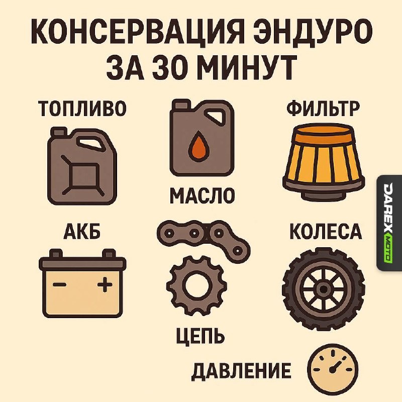 КОНСЕРВАЦИЯ ЭНДУРО/ПИТА ЗА 30 МИН чек-лист Топливо 🔵Карб: кран закрыть ➡️слить чашу. 🔵Инжектор: стабилизатор в бак ➡️ 2–3 мин поработать. Масло 🔵По возможности заменить сейчас (тёплый мотор + новый фильтр) — весной запустится легче. Воздушный фильтр 🔵 Промыть спец-средством➡️ высушить ➡️ пропитать маслом для пенников. Цепь 🔵 Очистить ➡️ высушить ➡️ смазать на тёплую цепь (не лить на диск). АКБ и электрика 🔵 Снять АКБ домой, подзаряд 1 раз в 3–4 недели 🔵 Разъёмы слегка обработать диэлектриком. Колёса/подвеска 🔵 Давление на хранение 1.2–1.5 bar. 🔵 Пару раз «прожать» вилку/аморт, байк держать чистым и сухим под дышащим чехлом. Быстрый чек ✔️Топливо ок ✔️Масло ок ✔️Фильтр ок ✔️ Цепь смазана ✔️АКБ снят ✔️Давление выставлено Пиши свои идеи, как ты поступаешь с байком перед холодами?😎