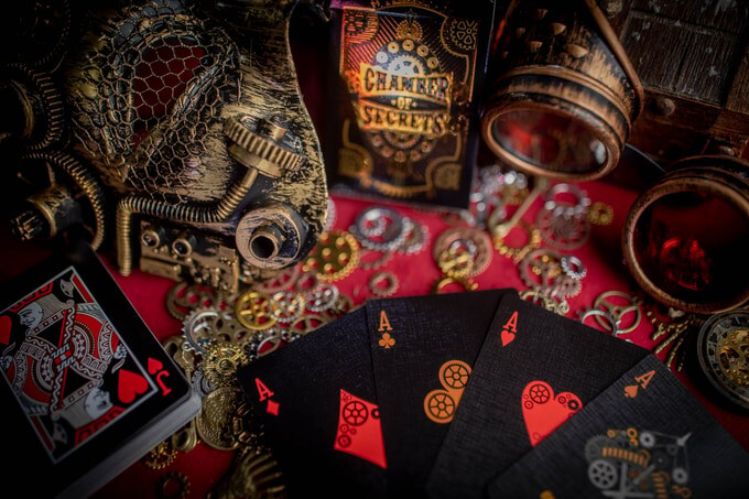 Визуальный язык шестерёнок, механизмов, индустриальных деталей, металлического блеска - вот что такое колода Chamber of Secrets. Вдохновленный стимпанком и магическим театром «Тайная комната» от фокусник Matthew Wright (лауреат премии World Championships of Magic) создал эту колоду. В изображение карт шестеренки в цветах меди и латуни. Сбор средств был на Kickstarter в 2023 г. Ограниченный тираж. Тип: игральные, для фокусов, коллекционные карты;