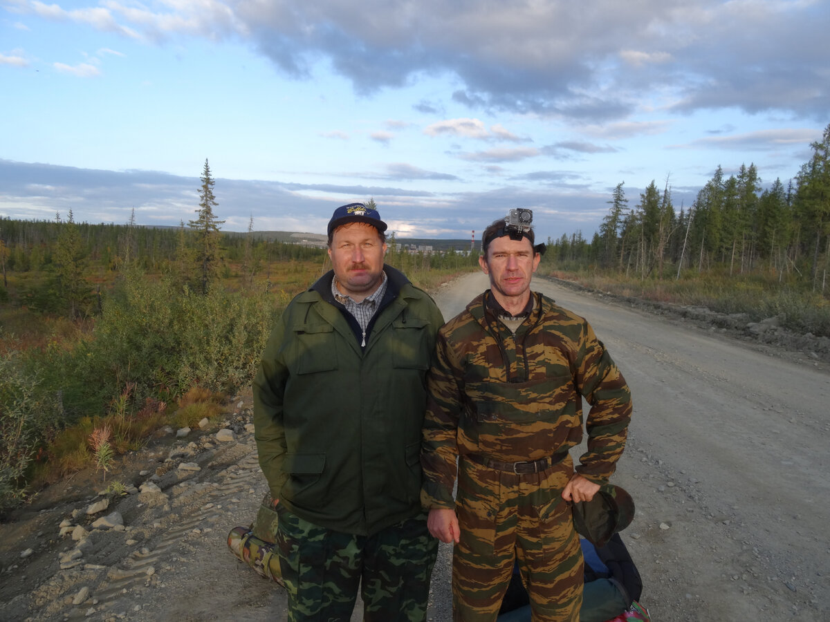 Высадились значит, на станции Харп. Это небольшой поселок, известный еще как Полярное сияние. В нем находится одна из самых мрачных тюрем Полярная Сова, в которой сидят пожизненно наиболее опасные рецидивисты. По слухам, из нее никто никогда никуда не убегал, да и бесполезно это, кругом тундра. Любой зек понимает, что побег оттуда это верная смерть. Но население спокойно соседствует со столь мрачным местом заключения. От станции мы быстро нашли мостик через речку, миновали поселок и найдя по навигатору технологическую дорогу, ведущую на рудник КонгорХром, пошли по ней. Проводница была права, температура быстро падает, еще час назад было +10С и вот уже не более двух градусов выше ноля. По краям дороги болотистая местность с жидкими елочками, малопригодная для устройства ночлега. Мимо проезжают Уралы, в кузове у них по два-три маленьких куска породы. Почему так мало? Пытаемся тормозить, но никто не хочет брать трех здоровых детин. Проехало три или четыре машины. Одна останавливается, в