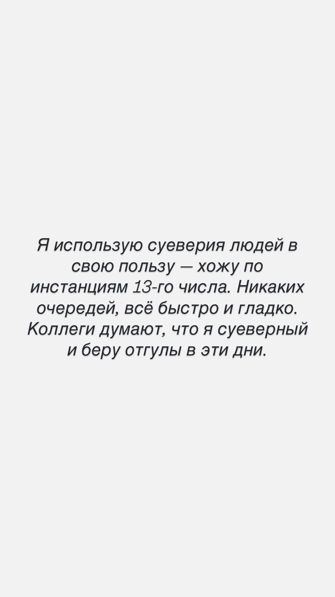 Я использую суеверия людей в свою пользу — хожу по инстанциям 13-го числа. Никаких очередей, всё быстро и гладко. Коллеги думают, что я суеверный и беру отгулы в эти дни.