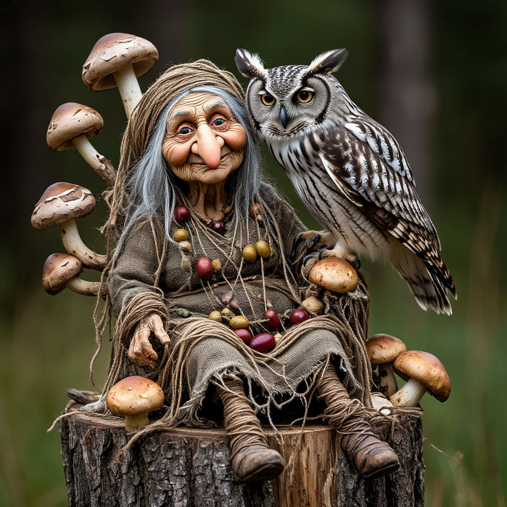 Яга от неожиданности потеряла равновесие и кувыркнулась с пенька в канавку. Когда она оттуда вылезла то имела весьма оригинальный вид. Веревочки и лохмушки на платье перепутались и растопырились, отчего бабка стала похожа на гусеницу шелкопряда. Кроме этого на колдуньиной голове, крепко вцепившись в седые букли, сидела перепуганная сова.