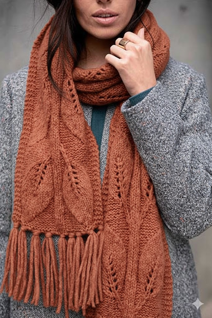 Октябрь — время, когда зонтик забывается дома, а шея просит защиты от прохладного ветра. Если вы любите вязание шарфов на осень, свяжите модель с мотивами кленовых листьев! Это одна из моих любимых идей вязания осенью — простая и эффектная. Беру пряжу в оттенках ржавчины, охры и терракоты — цвета, которые шепчут о лесных прогулках и золотой листве.