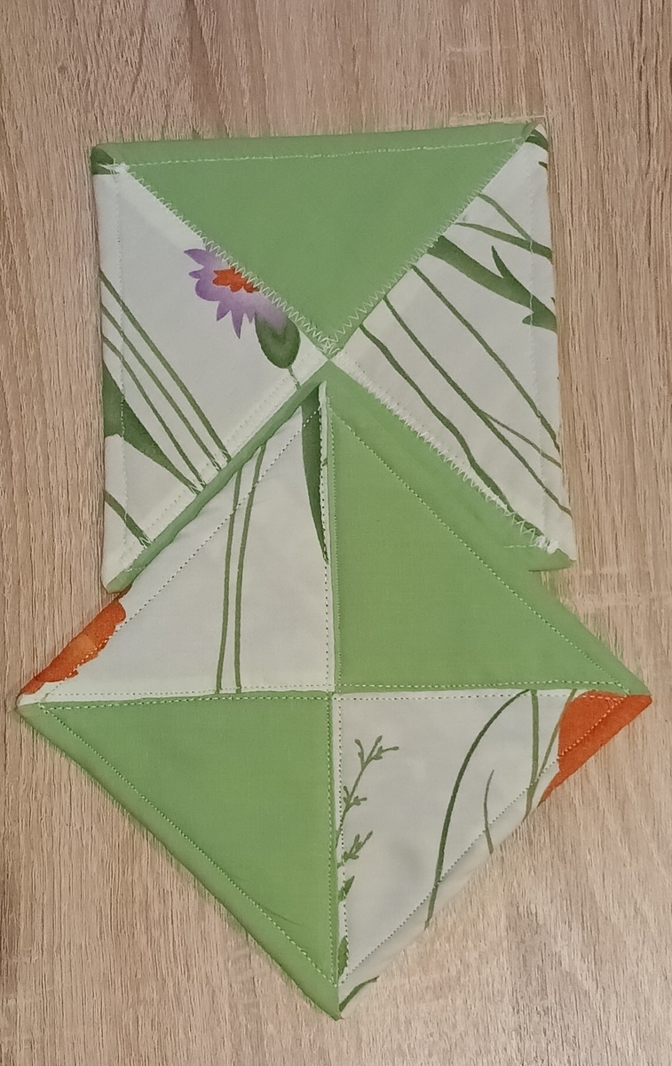 Для прихваток решила использовать остатки салатового сатина, оставшегося у меня от пошива лоскутного одеяла. Яркая зелень будет напоминать о теплом и солнечном лете.