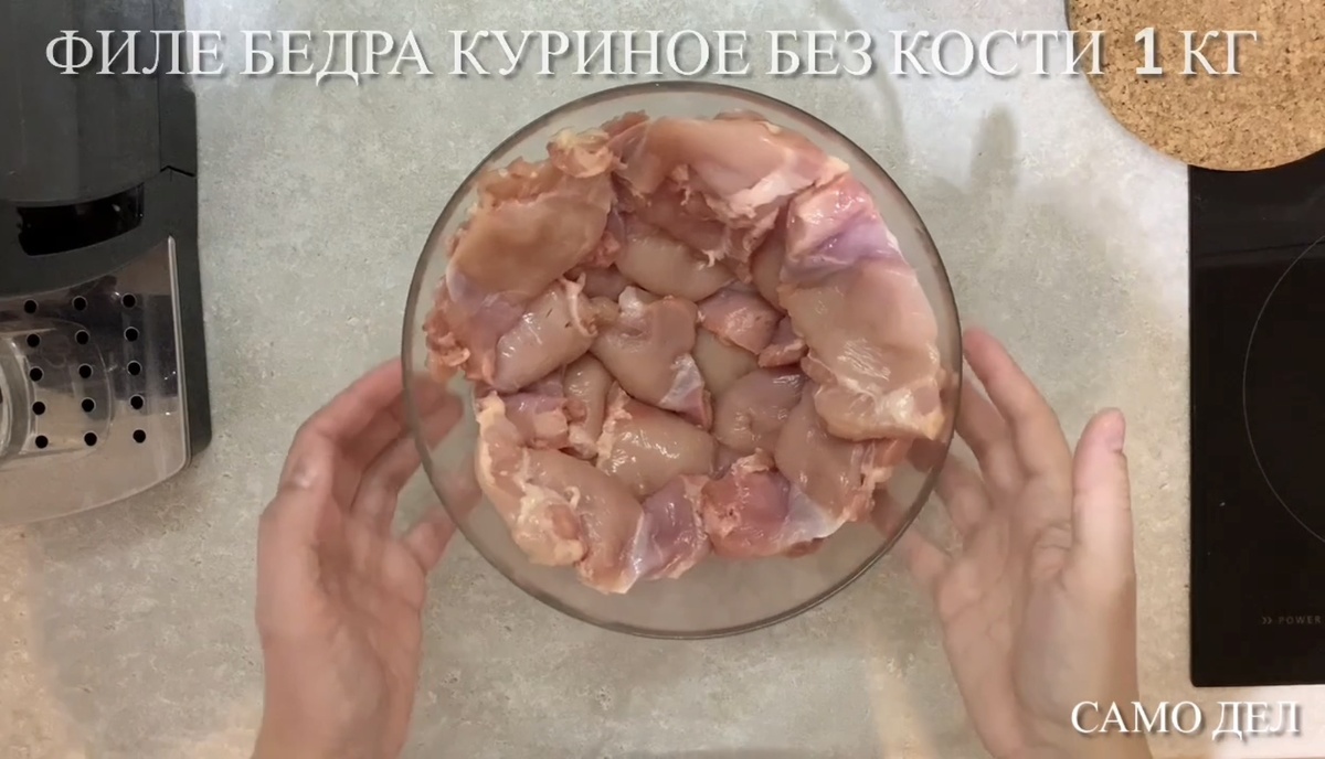 Хорошо промойте филе бедра под холодной водой и обсушите бумажными полотенцами. Это важно для того, чтобы маринад хорошо "схватился". Нарежьте филе на дольки среднего размера, примерно 3-4 см в ширину. Так кусочки равномерно промаринуются и приготовятся.