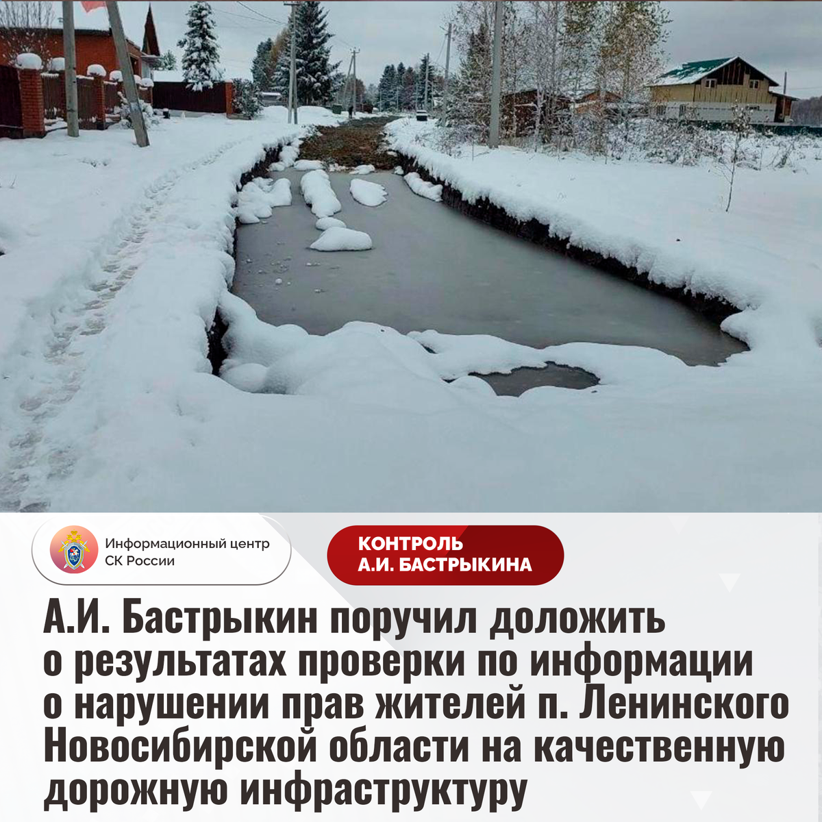А.И. Бастрыкин поручил доложить о результатах проверки по информации о нарушении прав жителей п. Ленинского Новосибирской области на качественную дорожную инфраструктуру В СМИ сообщается о нарушении прав жителей поселка Ленинского Новосибирской области на качественную дорожную инфраструктуру. На протяжении длительного времени дорога на одной из улиц находится в непригодном состоянии: отсутствует асфальтовое покрытие, при выпадении осадков грунтовое полотно регулярно размывалось, на поверхности имелись многочисленные ямы и колеи. При этом запланированный на май текущего года ремонт начат только в сентябре, однако работы не были завершены. В результате на участке образовался глубокий котлован, заполненный водой, из-за чего проезд автомобилей, в том числе транспортных средств экстренных служб, невозможен. В СУ СК России по Новосибирской области по данному факту организована процессуальная проверка. Председатель Следственного комитета Российской Федерации Александр Иванович Бастрыкин поруч