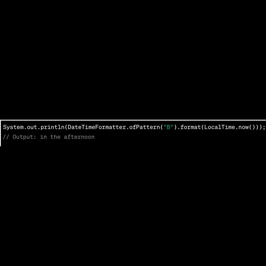 🚀 Совет по Java API Периоды дня в форматах java.time Если вы хотите указать период дня, например «утром», «днем» или «ночью», используйте шаблон форматирования с символом B. 🔥