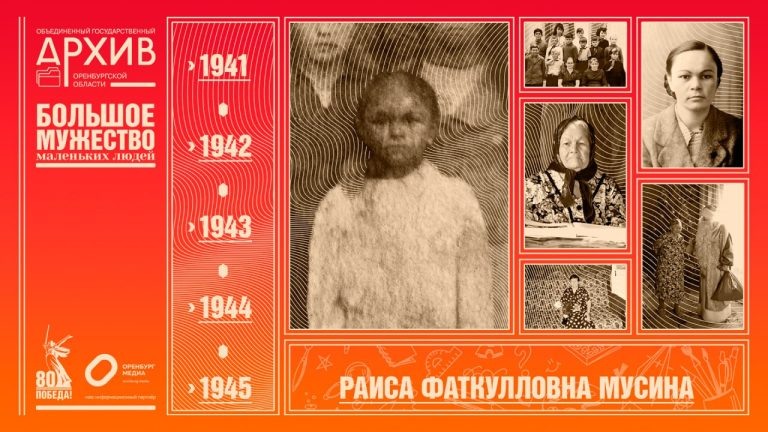 Объединенный Госархив Оренбургской области и Оренбург Медиа запустили аудиопроект, посвященный «детям войны». 80 историй – 80 уникальных роликов. Каждый день в 19.45. Героиня 27 выпуска — Раиса Фаткуловна Мусина. Она родилась 14 марта 1937 года в посёлке Купля Ташлинского сельского совета Троицкого, ныне Тюльганского района Оренбургской области. Когда началась Великая Отечественная война, Раисе Фаткуловне было 4 года. Её отца, Фаткулу Валиддиновича Мусина, призвали на службу в Красную армию в мае 1942 года. После принятия присяги папа был направлен в научно-испытательный институт военно-воздушных сил Красной армии в роту охраны красноармейцем стрелком. Там, в городе Ногинске, он доблестно и безупречно служил до конца войны. Награждён медалью «За победу над Германией».
