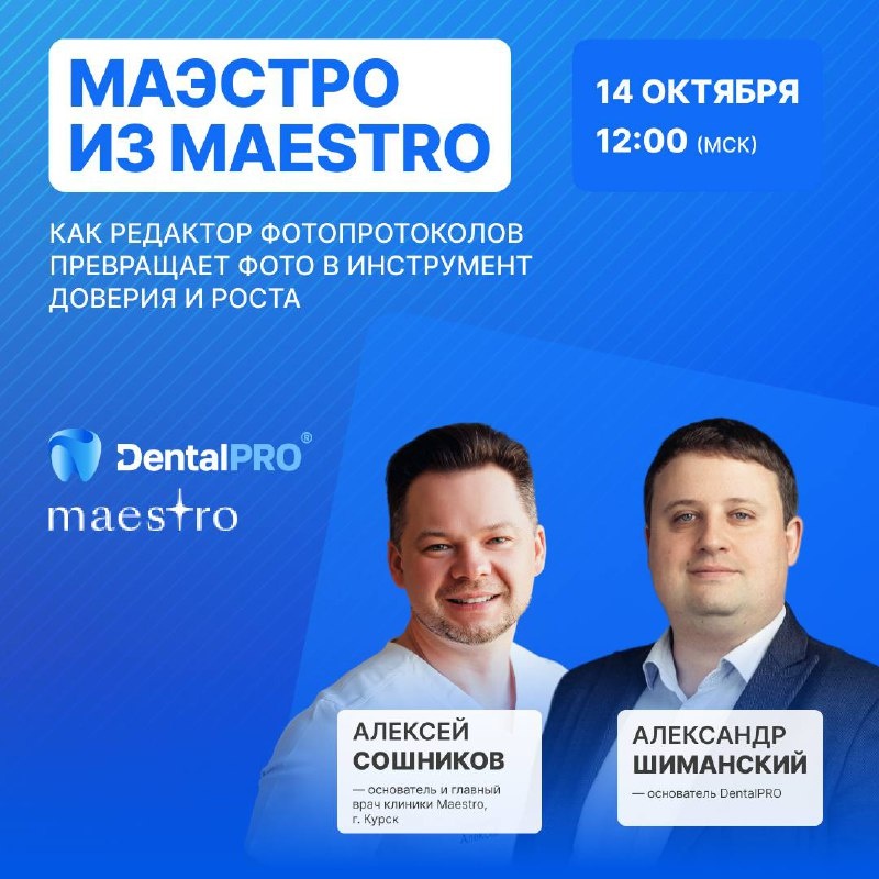 Фотопротоколы — базовый минимум лечения в 2025 году! ✔️ Коллеги, приглашаем вас принять участие в бесплатном обучающем вебинаре «Маэстро из Maestro: как редактор фотопротоколов превращает фото в инструмент доверия и роста». Вы узнаете: 💠 Почему фотопротоколы становятся стандартом клинической коммуникации? 💠 С какими проблемами сталкиваются практикующие стоматологи во время работы с фотопротоколами? 💠 Как редактор фотопротоколов DentalPRO изменил работу клиники Maestro? Наши эксперты: 🙎♂️ Александр Шиманский — основатель МИС 🦷 DentalPRO и эксперт в области автоматизации бизнес-процессов в стоматологии. 🙎♂️ Алексей Сошников — врач, основатель клиники Maestro и эксперт компании Micerium (Италия-Германия). Дата вебинара: 14 октября, вторник Время: 12:00 (МСК) Успейте принять участие! ⛓️💥 Ссылка для регистрации на вебинар #Вебинары