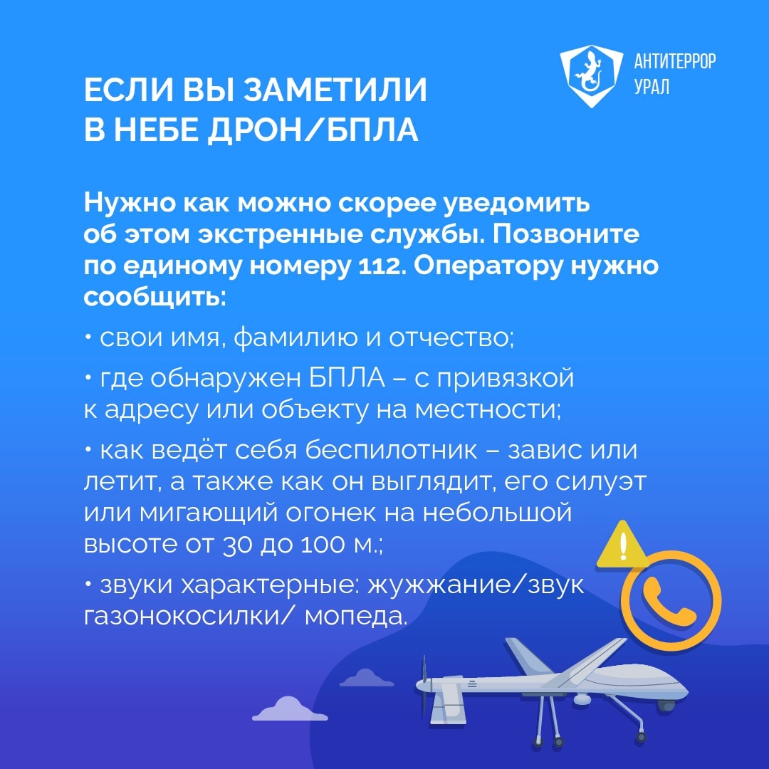 ❓Что делать если вы увидели в небе беспилотник «Антитеррор Урал» разработал простые правила действий при объявлении режима «Беспилотная опасность». При появлении в небе беспилотного летательного аппарата или дрона: 1⃣Покиньте опасную зону, автомобиль или автобус 2⃣Обязательно сообщите об увиденном по номеру 112 Оператору нужно сообщить: ▫ свои имя, фамилию и отчество ▫ где обнаружен БПЛА – с привязкой к адресу или объекту на местности ▫ как ведёт себя беспилотник – завис или летит, а также как он выглядит, его силуэт или мигающий огонёк на небольшой высоте от 30 до 100 м. ▫ характерные звуки: жужжание/ звук газонокосилки/ мопеда 🌁 Можете передать информацию в мобильном приложении «Радар.НФ» https://vk.com/wall-228061559_18 🎯 Если БПЛА находится рядом: 1⃣Спрячьтесь в капитальном строении или в укрытии с бетонными стенами и крышей, в подвале, в убежище 2⃣При отсутствии зданий - спрячьтесь за деревьями или в кустарнике Помните в целях антитеррористической безопасности на