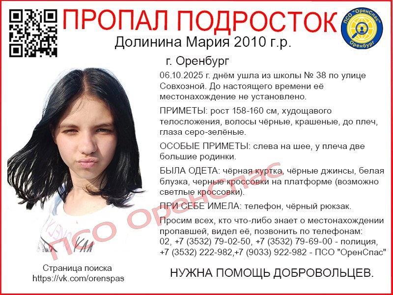 Просим всех, кто что-либо знает о местонахождении пропавшей, видел её, позвонить по телефонам: 02, +7 (3532) 79-02-50, +7 (3532) 79-69-00 - полиция, +7 (3532) 222-982, +7 (9033) 922-982 - ПСО "ОренСпас"