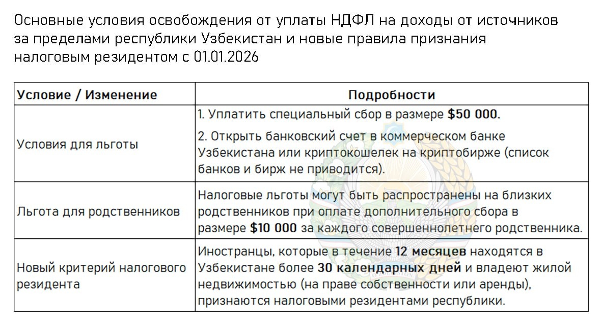 С 1 января 2026 года в Узбекистане вводится специальный налоговый режим для иностранных граждан, предусматривающий освобождение от уплаты НДФЛ на доходы от источников за пределами республики.