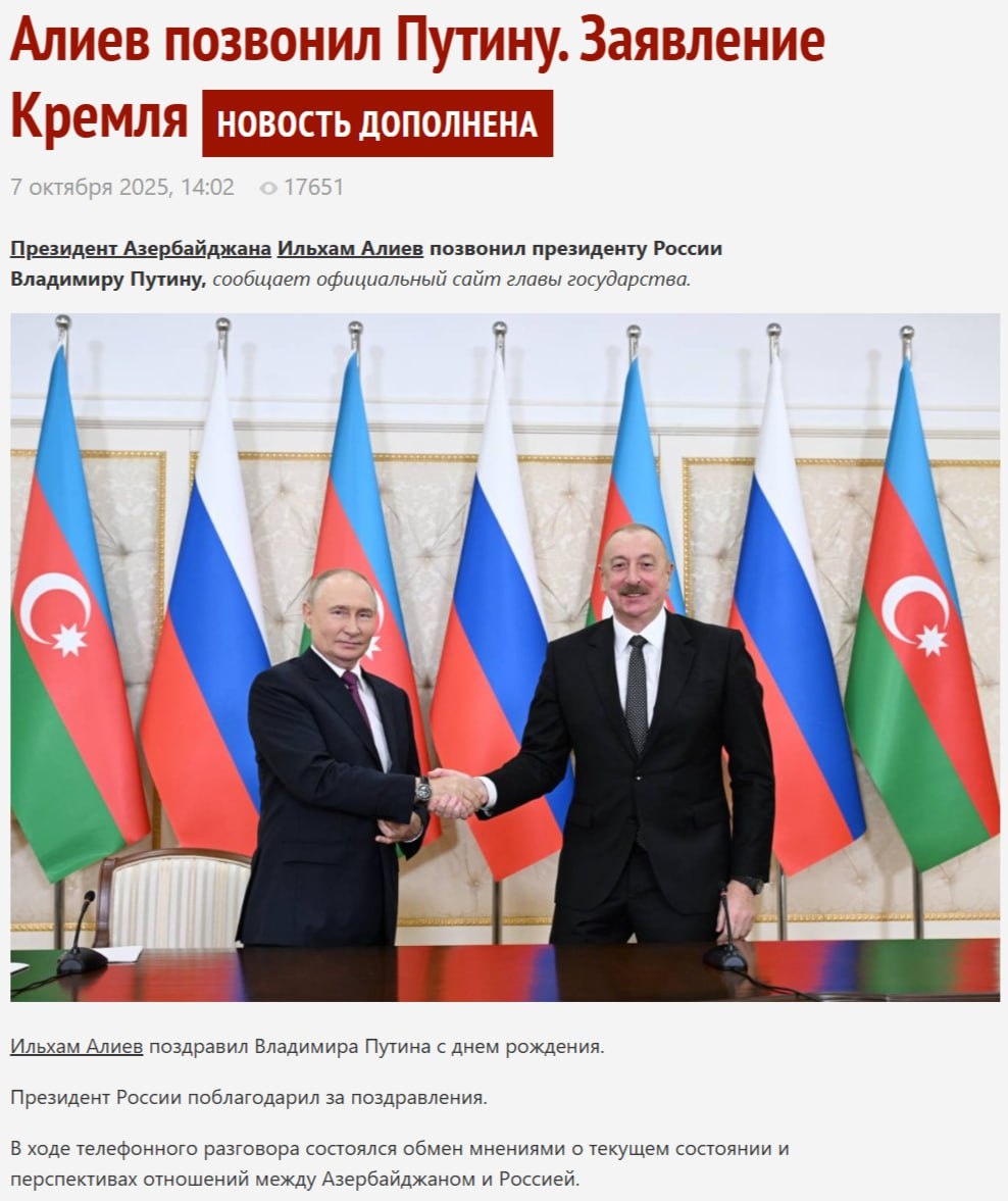 Напомню, что 7 октября Алиев сам позвонил и поздравил Путина с днем рождения.