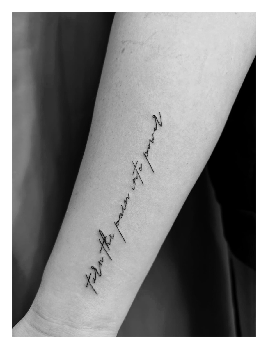 Татуировка содержит фразу «Turn the pain into power», что переводится как «Преврати боль в силу». Это вдохновляющее послание, которое может стать отличным выбором для тех, кто хочет подчеркнуть свою стойкость и способность преодолевать трудности. Идеи для размещения татуировки: Запястье — как на изображении, это место выглядит элегантно и подчеркивает смысл фразы. Лопатка — для более заметного и символичного размещения. Внутренняя сторона предплечья — удобное и личное место. Шея — минималистично и стильно, но требует аккуратности. Спина — можно дополнить рисунком, например, крыльями или абстрактным узором.