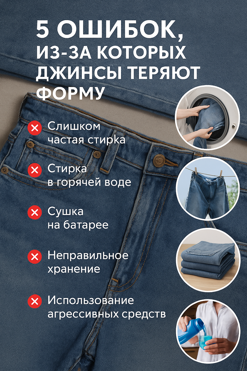 Любимая пара джинсов может прослужить вам годы — если правильно за ней ухаживать. Но часто они теряют вид гораздо раньше: вытягиваются на коленях, садятся после стирки или просто становятся бесформенными. Виноваты не джинсы, а ошибки, которые мы совершаем ежедневно. Ошибка №1. «Стираю после каждой носки» Джинсы не нуждаются в частой стирке. При каждом заходе в машинку ткань теряет прочность, краска вымывается, а форма искажается. 👉 Как правильно: стирайте джинсы не чаще одного раза после 5–7 носок. Чтобы освежить, достаточно проветрить или пройтись отпаривателем. ❌ Ошибка №2. «Ставлю высокую температуру» Горячая вода — главный враг денима. Ткань садится, эластан теряет эластичность, и джинсы уже не сидят так, как раньше. 👉 Как правильно: выбирайте деликатный режим при 30 °C и выворачивайте джинсы наизнанку. ❌ Ошибка №3. «Бросаю на батарею или в сушилку» Сильный нагрев разрушает волокна ткани. В результате джинсы становятся жёсткими, появляются заломы, а форма теряется. 👉 Как правиль