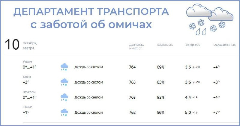 ❄️ Зима на подходе: Омский депортамент транспорта предупреждает о снегопаде и гололёде 10 октября в Омске и по области ожидается похолодание и мокрый снег, местами – гололедица. Температура продолжит падать, поэтому будьте особенно внимательны на дорогах. ⚠️ Водителям – держите дистанцию, не спешите, проверьте свет и резину. 🚶♀️ Пешеходам – переходите дорогу только в разрешённых местах и не забывайте про светоотражатели, чтобы вас было видно в темноте. Берегите себя и других участников движения! 📸: телеграмм-канал «Омский Дептранс»