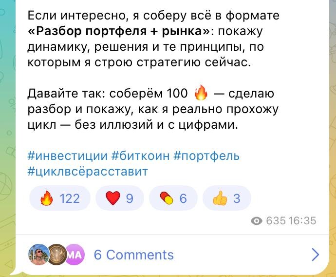 Ну что, вижу — интерес есть. Реакций собрали больше, чем я ожидал. Значит, начинаю готовить разбор. Сам, если честно, уже втянулся: захотелось оглянуться назад и трезво посмотреть — где сработала стратегия, а где я просто угадывал в удачный момент. Такой небольшой аудит цикла: что дало результат, а что можно было сделать умнее. Но сразу предупреждаю — разбор получат не все. Хочу, чтобы туда попала осознанная аудитория, а не просто «посмотреть, сколько заработал». Я выкладываюсь и делюсь тем, что обычно остаётся за кадром — вы, в ответ, проходите анкету. Это фильтр, чтобы остались те, кому действительно важно разобраться в своей стратегии. Ну а вы что думали — я просто возьму и выложу всё подряд? Нет уж. 😅 Давайте немного справедливости: я вкладываюсь — вы тоже вложитесь. Тогда у нас будет нормальный, равноценный обмен. Завтра расскажу как получить доступ. #биткоин #портфель #инвестиции #циклвсёрасставит
