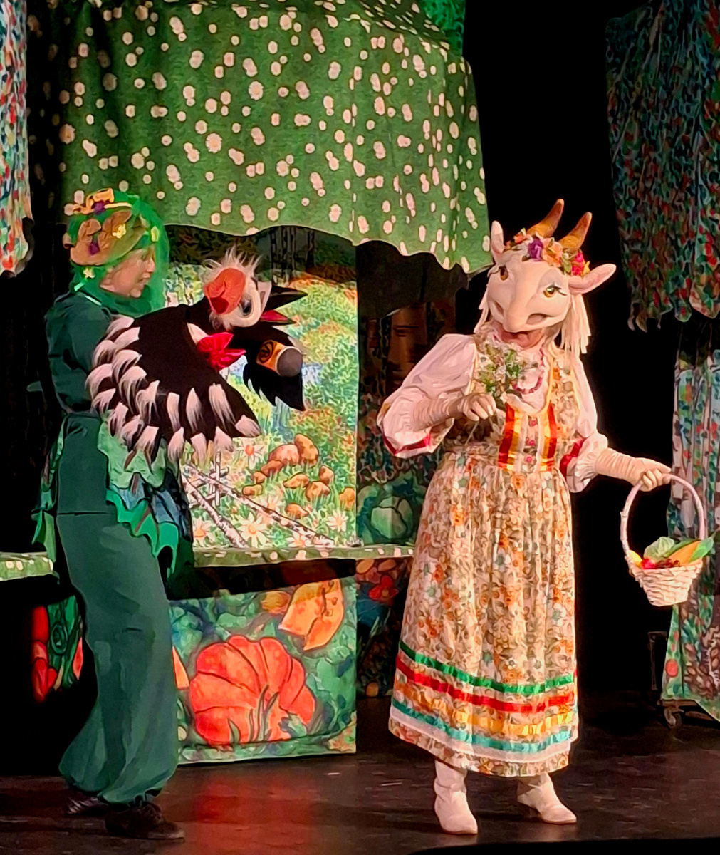"Семеро козлят" в Театре Марионеток. Это иное прочтение всем известной сказки. Здесь никто никого не съедает и никому не вспарывают живот. Нам представили добрую и поучительная версию сказки про козлят. У козлят есть музыкальные имена До, Ре, Ми, Фа, Соль, Ля, Си. И козлята посещают музыкальную школу Медведя. Имена так часто повторяют со зрителями, что к концу спектакля все ребята выучили нотки. Есть тут и новый персонаж Сорока. На протяжении всего спектакля Сорока ведёт репортаж и разносит новости по лесу. Сегодня необычный день - День Рождения Козы. И решили козлята, с волком и медведем подготовить сюрприз. У Волка, конечно был коварный план, но мудрый Медведь смог перехитрить лесного хищника. Благодаря отрицательной репутации Волка, его благие намерения ставятся под сомнение и более пристальное наблюдение со стороны Сороки. Волк и Коза то актёры, то куклы. Кукловоды виртуозно управляют своими персонажами, . Куклы даже шагают поочередно поднимая лапки. Все движения естественны