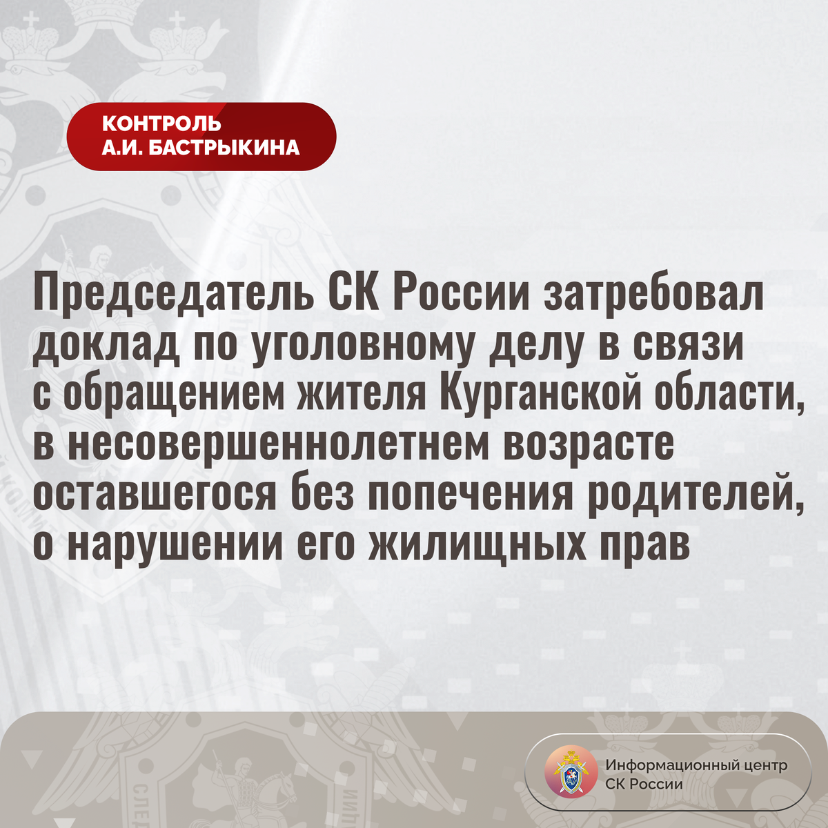 Председатель СК России затребовал доклад по уголовному делу в связи с обращением жителя Курганской области, в несовершеннолетнем возрасте оставшегося без попечения родителей, о нарушении его жилищных прав К Председателю СК России А.И. Бастрыкину в его приёмную «ВКонтакте» обратился житель Курганской области, в несовершеннолетнем возрасте оставшийся без попечения родителей, по вопросу нарушения его жилищных прав. Сотрудники детского дома, в котором воспитывался мужчина, а также органы опеки и попечительства не приняли мер к постановке заявителя на учет лиц, подлежащих обеспечению жилыми помещениями, сообщив о наличии закрепленного за ним частного дома в селе Утятское. Несмотря на то, что строение непригодно для проживания, заявитель лишен возможности реализовать право на получение льготного жилья. Обращения в компетентные органы результатов не принесли. В СУ СК России по Курганской области по поступившему обращению возбуждено уголовное дело. Председатель Следственного комитета Российско