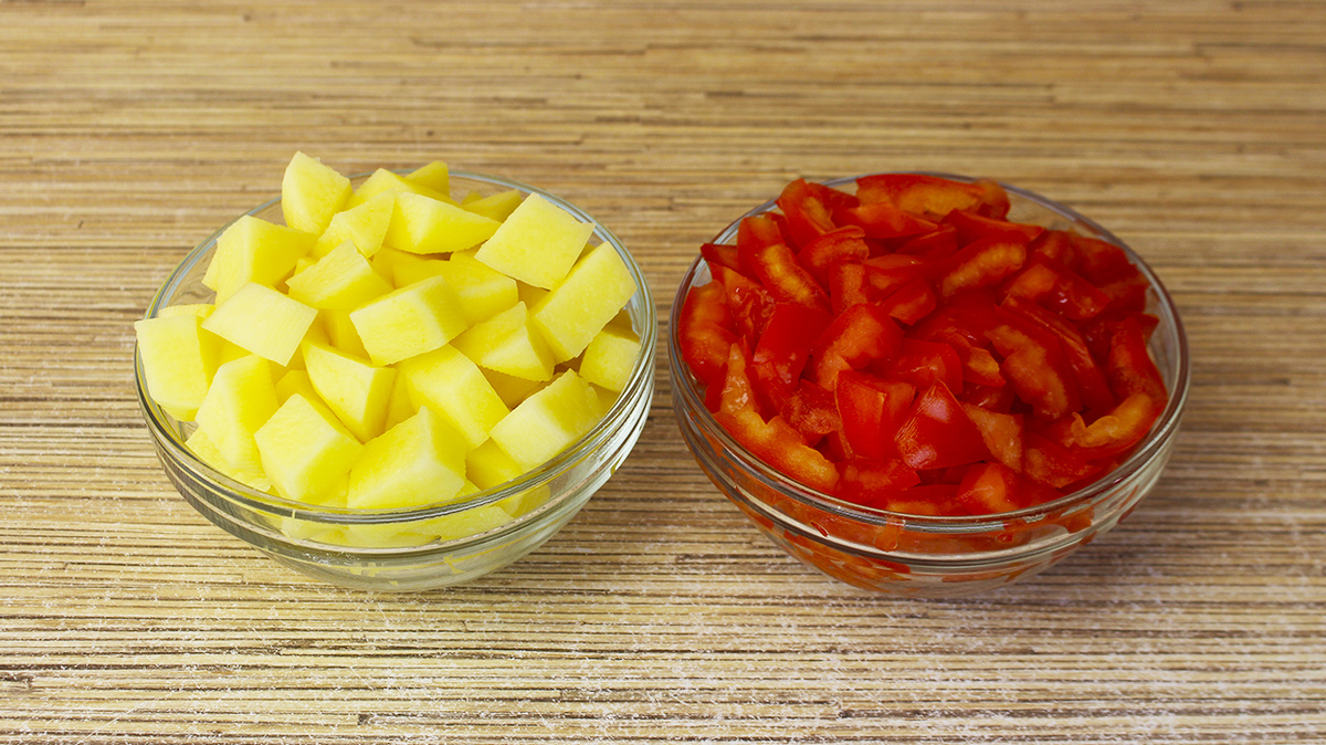Аккуратно нарежьте очищенный картофель кубиками. Размер кубиков должен быть достаточно крупным (примерно 1.5х1.5 см), чтобы картофель не разварился в пюре при запекании, а сохранил свою форму и текстуру.