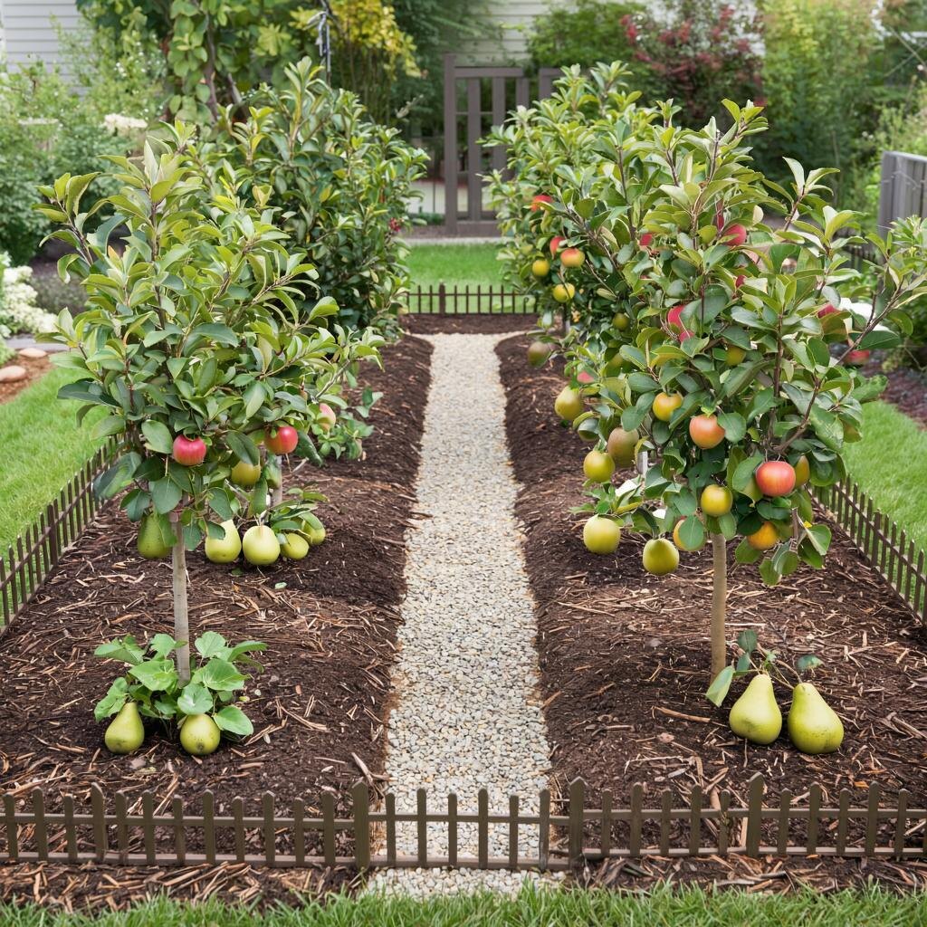 - Сад 3×3 м на полукарликах: 4 яблони (лето/осень/зима + опылитель) и 2 груши (ранняя/осенняя) по периметру, в междурядьях — земляника и календулы; по внешней границе — 3–4 кустика смородины.