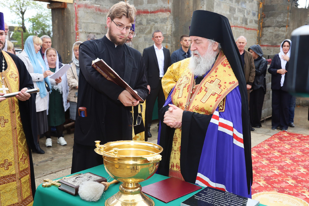 Епископ Сергий заложил в основание храма памятный камень и капсулу с именной грамотой, окропил строящийся храм и присутствующих святой водой.