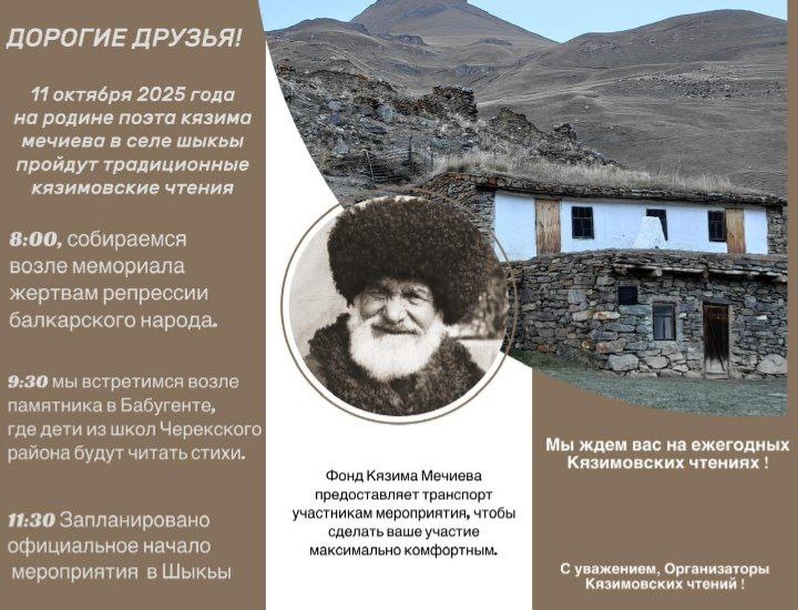 11 октября 2025 года в Черекском районе пройдет праздник поэзии в честь основоположника балкарской литературы, просветителя и философа Кязима Мечиева. 🔹9:30 - чтения возле памятника К. Мечиева с. Бабугент 🔹11:30 - праздничное мероприятие с. Шыкъы Также во всех библиотеках и школах района пройдут выставки, чтения и литературные встречи.