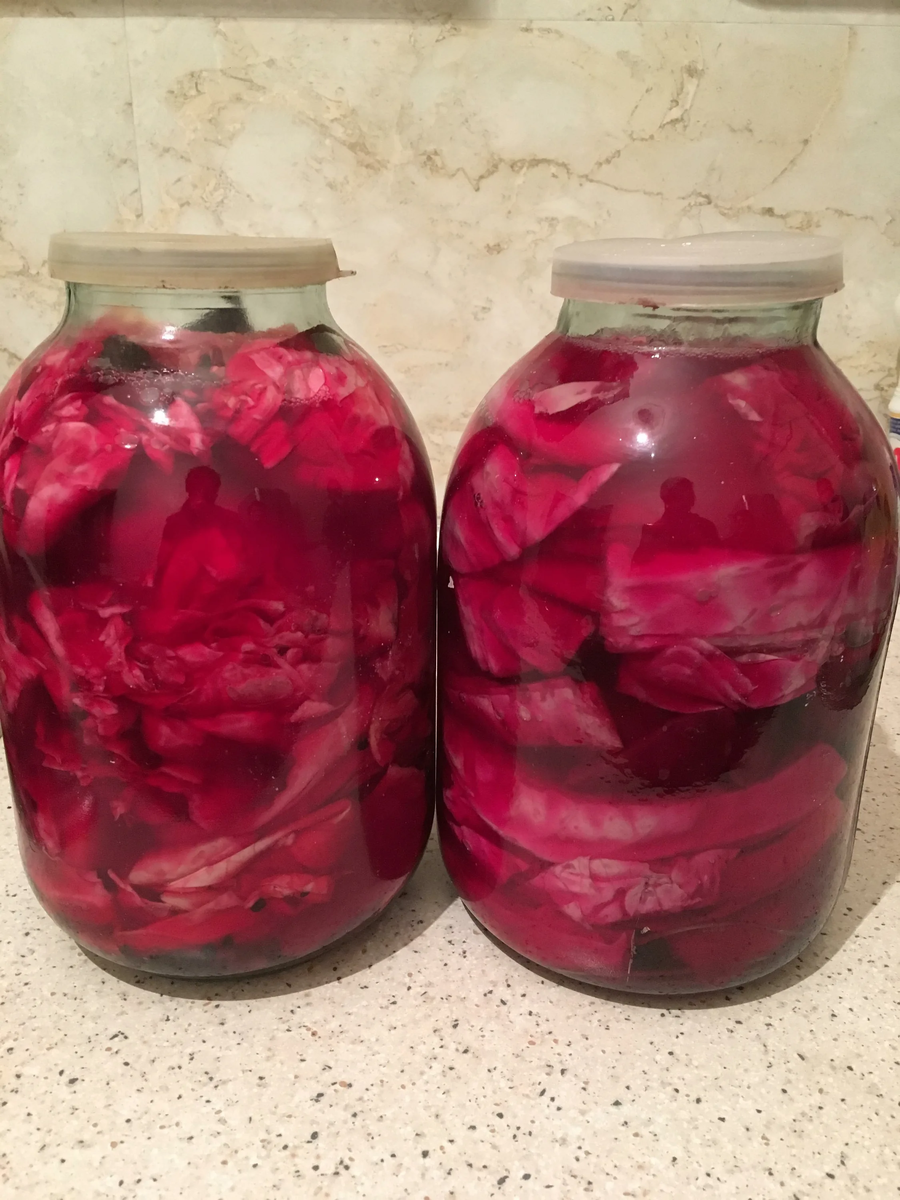 Пикантная, ароматная, хрустящая - именно такая получается эта капусточка с красивым рубиновым оттенком и пряным вкусом. 5-6 кг белокочанной зимней капусты 3 крупные бордовые свеклы 2 стебля сельдерея по 3 лавровых листа на банку по 1 ч. л. черного перца горошком на банку по 1-2 шт. гвоздички по 3 горошины душистого перца по 2 см. корня хрена на банку Банки ошпарить кипятком. Капусту нарезать крупными кусками, но они должны свободно проходить в горлышко банки. Свеклу почистить и нарезать полукружочками. Сельдерей порубить соломкой, хрен натереть на терке или мелко нарезать. Наполнить банки капустой, чередуя куски со свеклой, сельдереем и присыпая корнем хрена. В каждую банку добавить лавровый лист и оба перца. Гвоздика по желанию. 2 л кипятка 100 мл растительного масла 200 мл яблочного уксуса 6 ст. л. соли 150 гр. сахара Все прокипятить и залить горячим в банки с овощами. Дать капусте остыть в банках, закрыть пластмассовыми крышками и вынести на холод. Пробовать можно через сутки, но бу