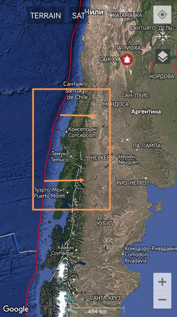 На границе Аргентины и Чили дегазируется зона между Пуэрто Монт и Сантьяго на уровне М6+. В течение 9 дней есть вероятность сильного землетрясения по отмеченной зоне. ==== On the border of Argentina and Chile, the zone between Puerto Montt and Santiago a is being degassed at the M6+ level. There is a possibility of a strong earthquake in the marked area within 9 days.