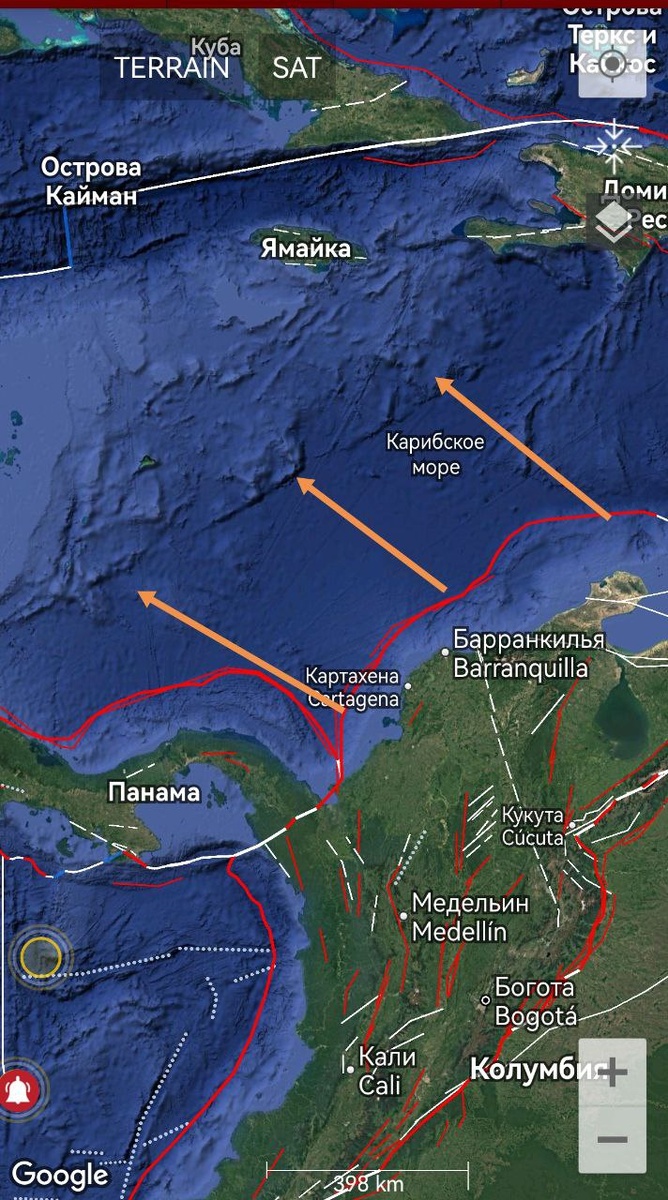 На уровне М6+ трассируется Карибское море северо-западнее Колумбии.