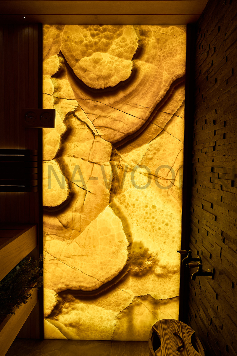 Вы когда-нибуд видели, как сквозь камень пробивается свет? Оникс — не просто отделка. Это полупрозрачный, пронизанный жилами минерал, который преображает пространство, наполняя его теплым, медовым сиянием. Кажется, что сама баня начинает светиться изнутри. Но баня — место суровое: пар, перепады температур, влага. Возникает резонный вопрос: а не «убить» ли такую красоту за один сезон? Давайте разбираться, где и как использовать оникс, чтобы он радовал годами. ✨ Волшебство и практика: куда вписать оникс в бане? 1. Световая панель в парной. Это главный козырь. Представьте: вместо холодной LED-ленты — тёплая, живая стена из подсвеченного оникса. Свет проходит сквозь камень, создавая неповторимую игру теней и удивительную, расслабляющую атмосферу. Важно: размещайте такую панель вдали от прямых брызг воды на полки. 2. Фартук или изголовье в комнате отдыха. Здесь оникс раскроется полностью. Он станет роскошным акцентом, вокруг которого строится весь дизайн. Теплый на ощупь, он добавляет