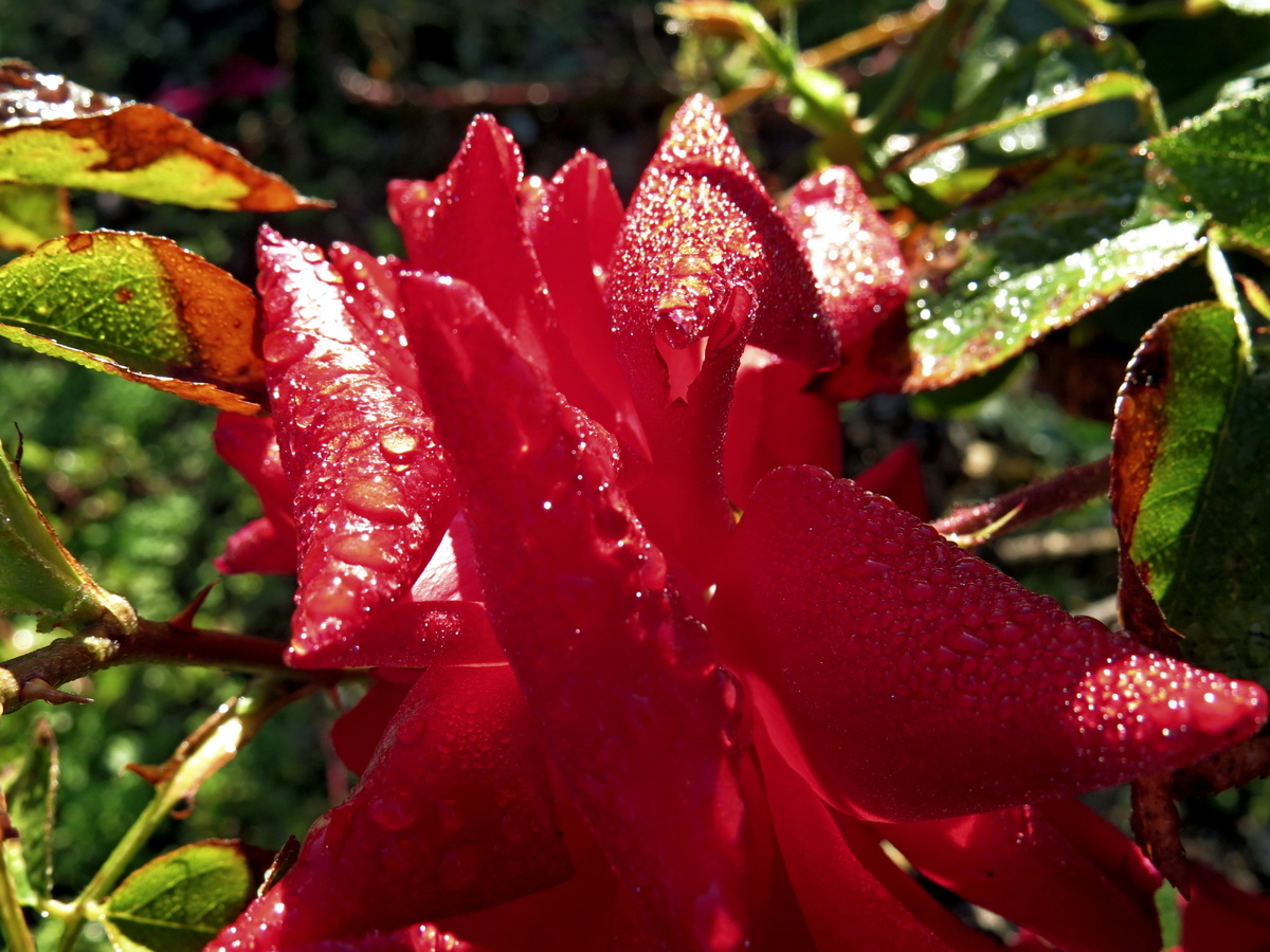 Ходить между цветущих кустов роз, усыпанных капельками росы, это, как гулять по сказке. Не возможно оторваться от созерцания бархата на лепестках. Солнце еще не коснулось всех роз. Некоторые еще спят, опустив свои тяжелые головки. Где-то молодой и озорной бутон, воздев свои тоненькие лепесточки, словно руки к небу, хочет закружиться в быстром вальсе. А может это рождается та самая прекрасная женщина в мире? Лакшми! Некогда стоять ждать этого таинства. Глаз бежит дальше по кустам, останавливаясь на каждом цветке. Вот гордая молодая красавица, осознавая свою королевскую красоту, склонив слегка пышную головку, ждет своего воздыхателя. Ах, розы! Ах, роса! Как же вы подходите друг к другу. Как эти капельки держаться на этих нежных лепестках? Где-то бархатом застилают лепесток. Где-то мелким бисером рассыпятся невзначай. Где-то крупной бусинкой устроятся на листке, как на ладони. То устроятся в рядышек по краешку лепестка. Как они это делают? Остановилась. Оглянулась вокруг. Все газон