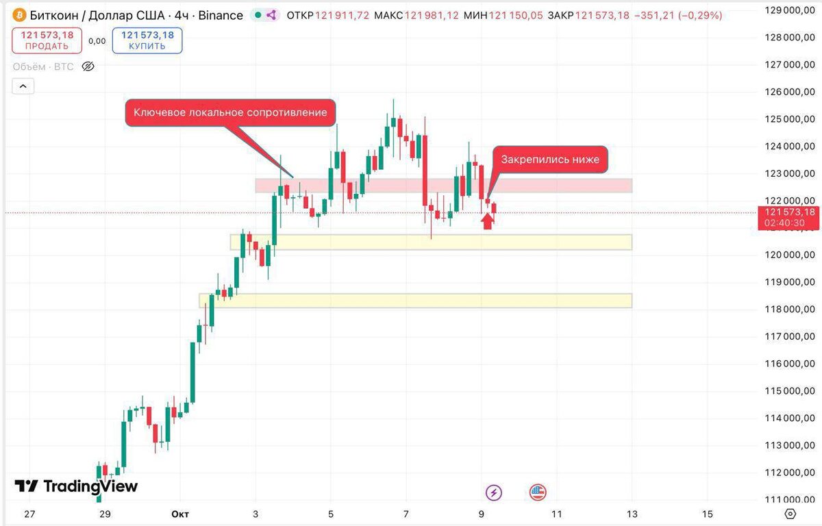 Пока большинство ждёт пробоя вверх, цена может сползти к зоне $121K — $118K, где крупные игроки будут собирать ликвидность.