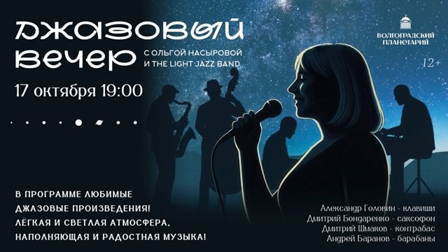 .......................................... ОСЕНЬ ПОД ЗВЁЗДАМИ: ДЖАЗОВЫЙ ВЕЧЕР В ПЛАНЕТАРИИ #КонцертВпланетарии .......................................... ⠀ ⠀ Друзья! ⠀ 17 октября в 19:00 приглашаем на уникальное событие — "Джазовый вечер с Ольгой Насыровой и The Light Jazz Band" под звездным куполом планетария! ⠀ ⠀ В программе: ⠀ ⚡ Бархатный вокал Ольги Насыровой; ⚡ Импровизации The Light Jazz Band; ⚡ Атмосферные полнокупольные визуализации; ⚡ Знакомые и любимые джазовые композиции. Подарите себе незабываемый осенний вечер в компании прекрасной музыки и звездного неба! ✅ 800 рублей ✅ Купить билет ✅ 8 (8442) 24-18-80 ⠀ ⠀ ⠀ Билеты уже в продаже! Успейте купить лучшие места. 🚀 Космос ближе, чем кажется - ПОДПИСАТЬСЯ - Волгоградский планетарий