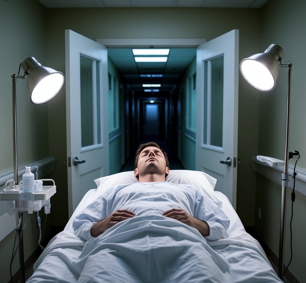 Положение тела, в принципе, казалось удобным, смущало лишь одно — я не мог пошевелиться. Открыв глаза, я обнаружил себя в ярко освещенном медицинском кабинете без окон, но зато с двумя дверьми. Одна была открыта и за ней можно было разглядеть темный коридор какой-то поликлиники. Вторая была заперта, из замочной скважины торчал ключ с небольшой биркой. Несколько ламп одновременно били в глаза. Я зажмурился и попытался отвернуться, но не смог: голова оказалась надежно зафиксированной в одном положении, равно, как руки, ноги, таз и плечи.
