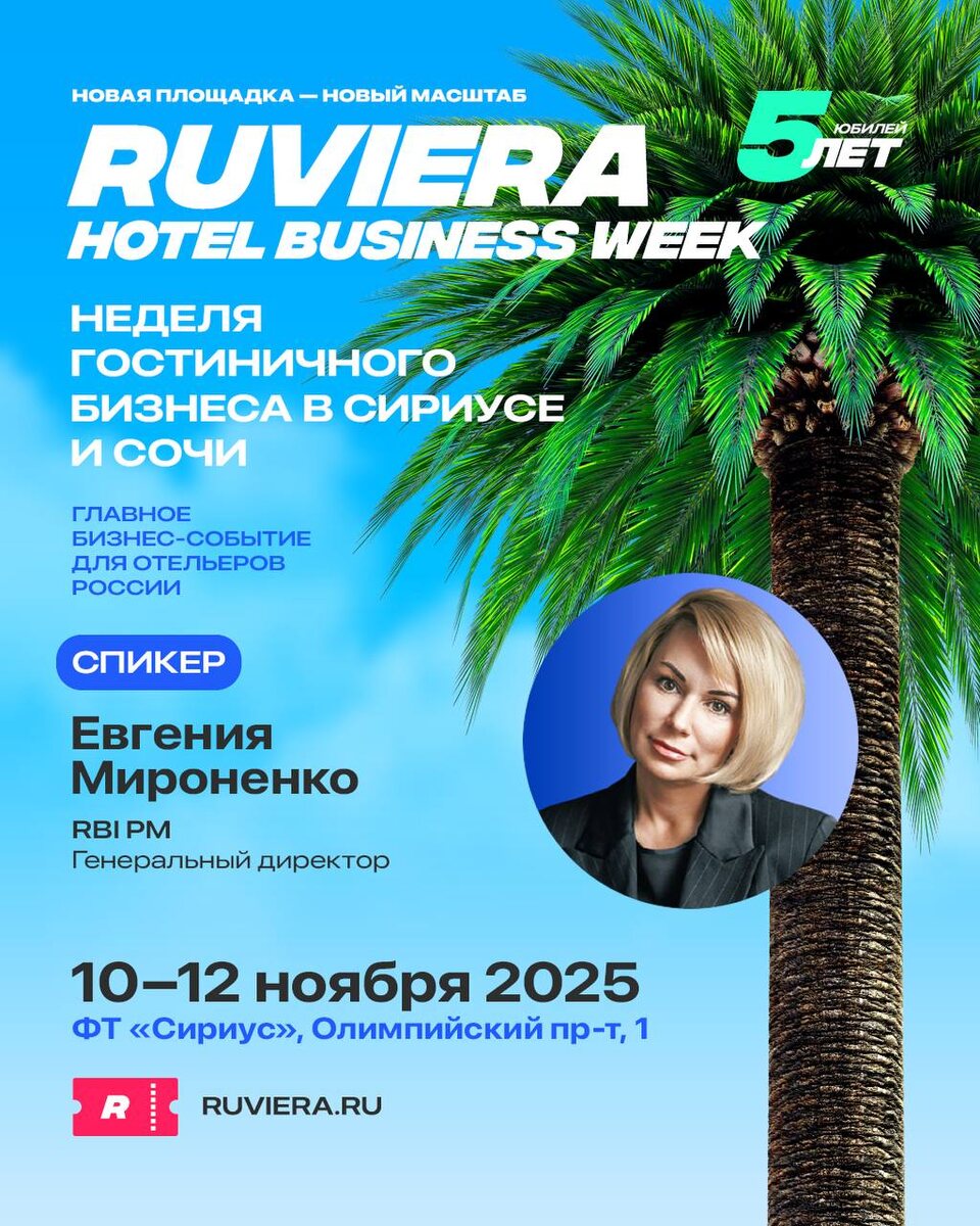 В моем ноябре появилась важная точка — 10–12 ноября, RUVIERA Hotel Business Week. В этом году — Сочи, «Сириус» и снова встреча с коллегами, которыми вдохновляюсь. Это уже пятая RUVIERA, а для меня — третья и особенная. Каждый раз она становится не просто форумом, а пространством смыслов и настоящего профессионального диалога. В программе всё как всегда насыщенно: выставка, форум, саммит, рейтинг, вечерние встречи. Но главное — люди. Атмосфера, в которой хочется говорить о будущем индустрии, о новых моделях, об ответственности и красоте сервиса. RUVIERA для меня — про развитие, про энергию, про доверие. Про то, что делает гостиничный бизнес живым. До встречи на «Рувьере»! Новости о мероприятии