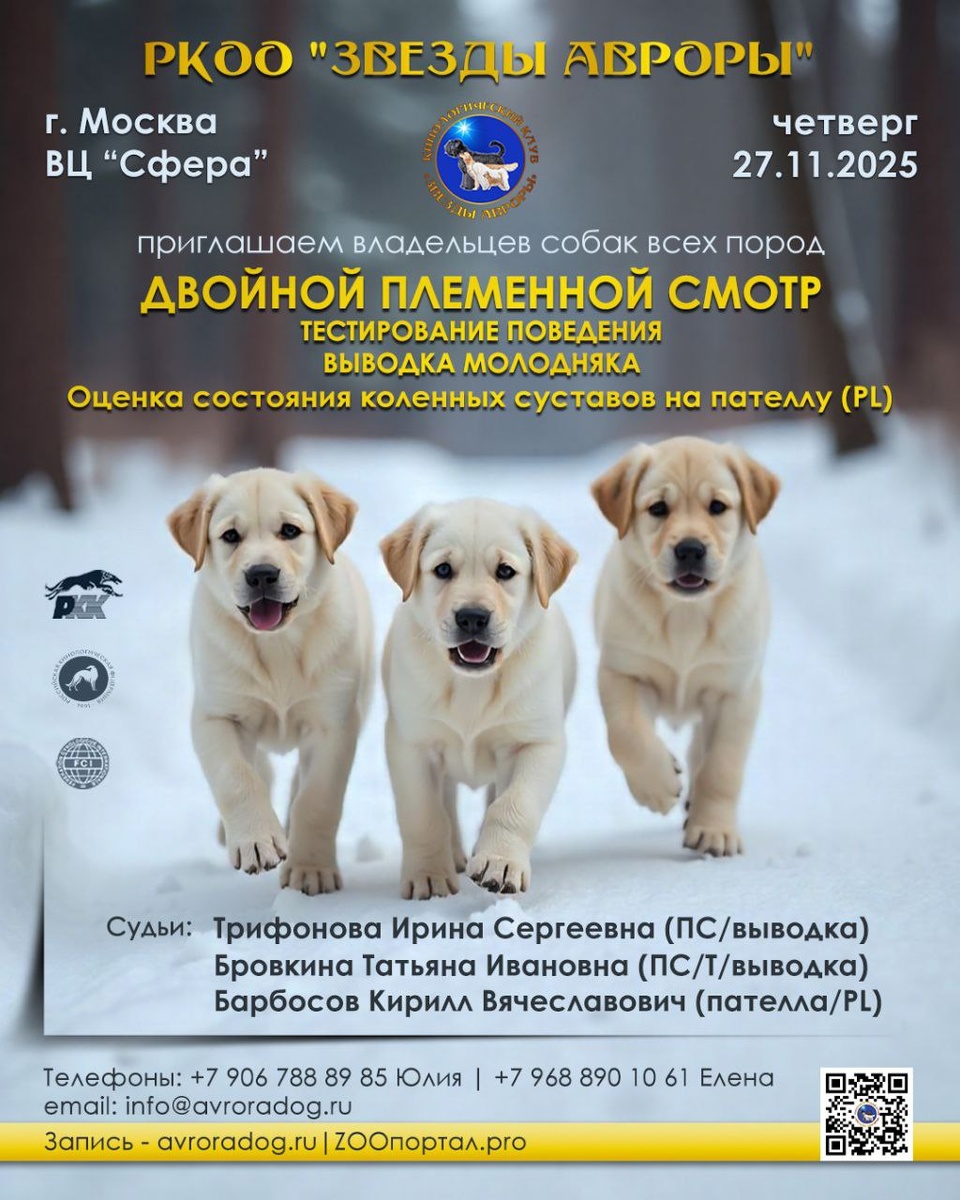Дорогие друзья! Приглашаем на наш очередной комплекс зоотехнических мероприятий, где за 1 день можно получить пожизненный допуск в разведение! Мероприятие состоится 27 ноября 2025 г., в ВЦ Сфера. Приглашенные судьи: Бровкина Татьяна Ивановна (племсмотр, тестирование поведения) Трифонова Ирина Сергеевна (племсмотр) Размеры Добровольного Целевого взноса: - до 31 октября — 2000 руб. — один судья, 3500 руб. — два судьи; до 26 ноября — 2500 руб. — один судья, 4500 — два судьи. Тестирование поведения (судья — Бровкина Т.- 1700 руб. на весь период. Пателла (PL) (ветврач Барбосов К.) - 2500 руб. на весь период. Выводка молодняка — 1000 руб. Записаться можно по телефону: +7 906-788-89-85 Юлия, +7 910-452-60-70 Татьяна, +7 968 890-10-61 Елена или отправив заявку на почту: info@avroradog.ru Запись через Зоопортал: Племсмотр - https://zooportal.pro/show/17375600/#content; Тестирование поведения - https://zooportal.pro/show/17375612/#content,; Пателла - https://zooportal.pro/show/17400268
