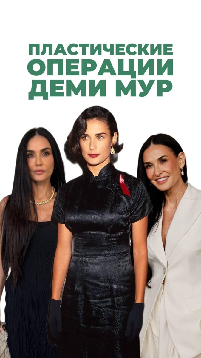 Фотокарточки Деми Мур так и просятся на обложки журналов! Изысканные черты лица, естественность, о которой так много говорят… Но, на минуточку, актрисе 62! И далеко не все её эксперименты со внешностью были удачными… Давайте начнём с начала! 👌«Первой ласточкой» стала РИНОПЛАСТИКА. Ок. Принимаем! Носик, и правда, получился аккуратный и вписался в архитектуру лица! Затем папарацци заметили новую грудь. После рождения трёх детей актриса сделала МАММОПЛАСТИКУ — и стала секс-символом целого поколения. После развода с Брюсом Уиллисом Деми Мур, как многие женщины, искала себя и доказывала окружающим, что ещё «ого-го» — и, по всей видимости, решилась на контурную пластику. А ещё заменила эндопротезы на более натуральные. Что ж, мотивация понятна — внимание общественности обеспечено. На крючок попался и Эштон Кутчер. А новый бойфренд (к тому же, весьма молодой) — это новые обязательства… и стремление выглядеть ещё лучше. Так в жизнь Деми Мур вошла БЛЕФАРОПЛАСТИКА. Сначала нижняя. Потом л