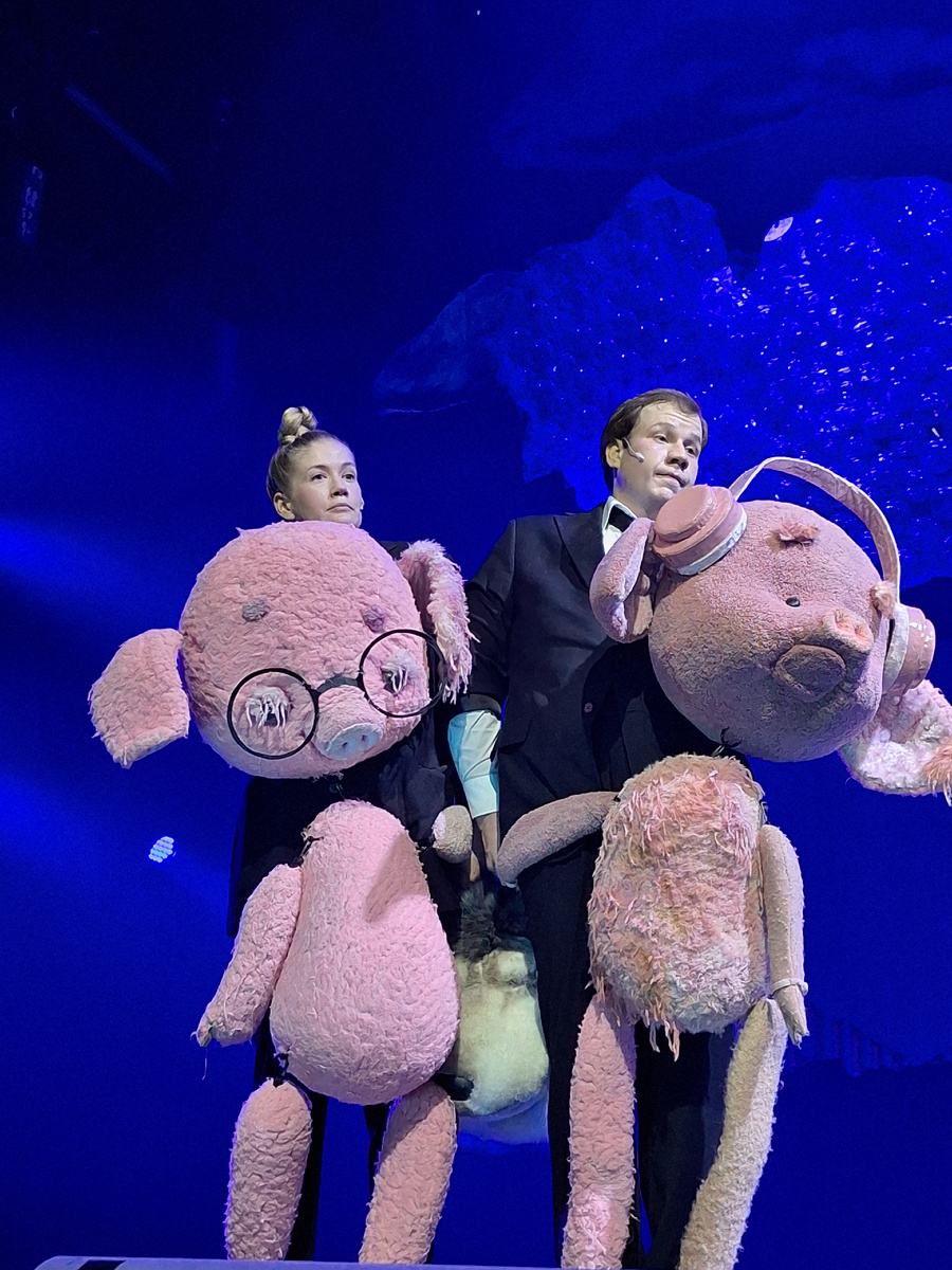 Театр на Таганке приоткрыл завесу тайны долгожданной премьеры "Три поросёнка.Ой". И это Ой - вполне здесь справедливо ибо это было ярко, неординарно и с моралью, к счастью, не столь нарочитой, но очень правильной. Эта постановка - совместный проект Театра на Таганке и М_Фабрики детского контента. Организатором выступил Российский фонд культуры. Все же в детстве читали сказку Сергея Михалкова "Три поросёнка"? И вот благодаря внучкам Анне и Надежде Михалковым эта история ожила на сцене Театра на Таганке, причем такое прочтение ничуть не хуже классического варианта. Честно говоря, всегда опасаюсь, когда берутся придумать что-то новое из всем известной сказки, но здесь все получилось просто замечательно! Главным героем и рассказчиком стал огромный Волк. Он, конечно же хищник (в раздражении сожрал всю сказку про Трёх поросят), но очень начитанный и умный. Буквально на коленке (из детских рисунков, которые дети нарисовали перед спектаклем в фойе, и реквизита из других спектаклей) постави