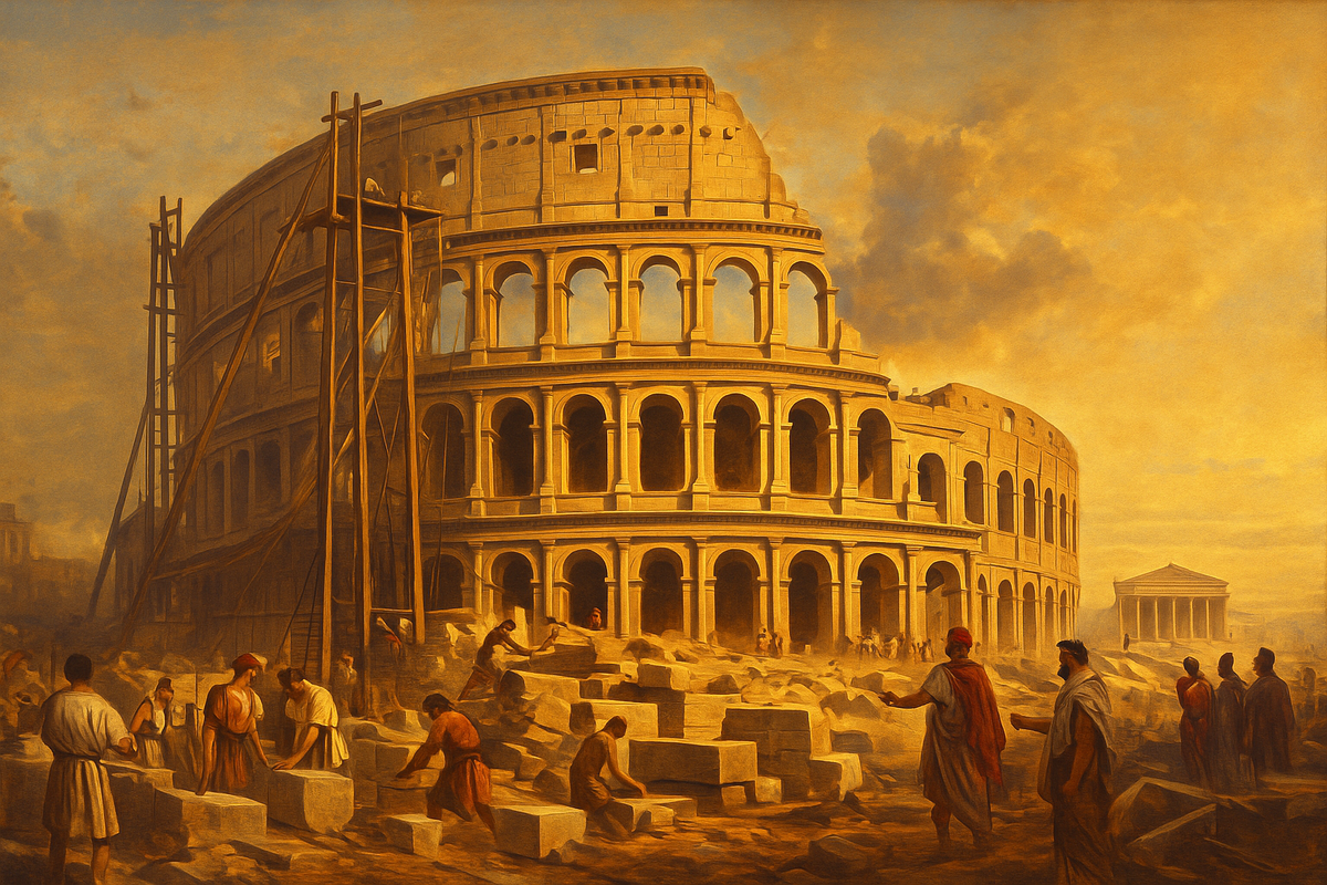 Колизей, или амфитеатр Флавиев, воздвигнут в самом центре Рима вскоре после падения Нерона. Император Веспасиан приказал стереть с лица города следы личной роскоши тирана — на месте его “золотого дома” выросла арена, посвящённая народу. Впервые в истории монумент не восхвалял одного человека, а служил всем.