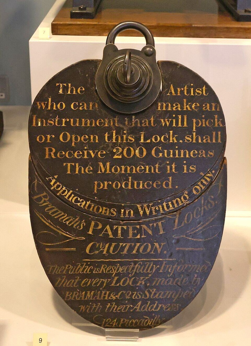 Представьте себе: на дворе 1790 год, и вы оказались на лондонской улице Пикадилли, 124. Прогуливаясь мимо витрин, вы замечаете, что одно окно притягивает взгляд. За стеклом магазина компании Bramah Locks Company красуется необычное устройство — замок, не совсем похожий на простые висячие замки, но выглядящий куда более внушительно. Под ним смелая надпись гласит: «Мастер, который сумеет изготовить инструмент, способный взломать или открыть этот замок, получит 200 гиней в тот же миг, как только представит его».