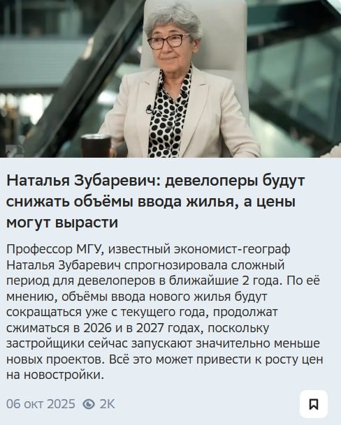 Профессор МГУ, известный экономист-географ Наталья Зубаревич спрогнозировала сложный период для девелоперов в ближайшие 2 года. По её мнению, объёмы ввода нового жилья будут сокращаться уже с текущего года, продолжат сжиматься в 2026 и в 2027 годах, поскольку застройщики сейчас запускают значительно меньше новых проектов. Всё это может привести к росту цен на новостройки. ➡️ Обсуждение здесь ➡️ Экосистема | Посуточный бизнес ➡️ Подписаться на канал | Посуточники России ➡️ YouTube | VC.ru | VK.ru | Дзен | 2025