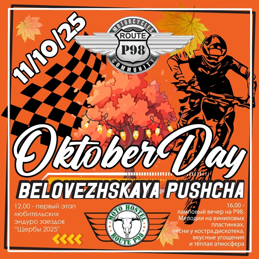 🔁 Дальняк.рф™: Дорогие друзья! Приглашаем вас осеннюю вечеринку "October Day"🍁. Это мероприятие станет приятным завершением мотосезона и подарит массу положительных эмоций. 11 октября мы подготовили для вас: ‼Любительские эндуро заезды «Щербы 2025». Это не официальные соревнования, а возможность весело провести время и прокатиться на мотоцикле в интересном формате. 11:00 – Сбор участников и регистрация. 11:30 – Осмотр трассы, брифинг и инструктаж. 12:00 – Старт заездов. ☕Для всех гостей на территории будет работать чайная зона. 🥄14:00 – 15:00 – Горячий обед на «Route P98». ‼Эндуро прохват «Дорогами заповедной пущи». Выезд запланирован на 15:00. ‼Для любителей природы и осенних пейзажей будет возможность прогуляться по лесу Беловежской пущи, собрать грибы, составить букеты из осенних цветов или просто насладиться тишиной. ‼С 16:00 на базе «Route P98» - ламповый вечер с музыкой из патефона и виниловых пластинок. В 17:00 начнётся мастер-класс по приготовлению суши от професс