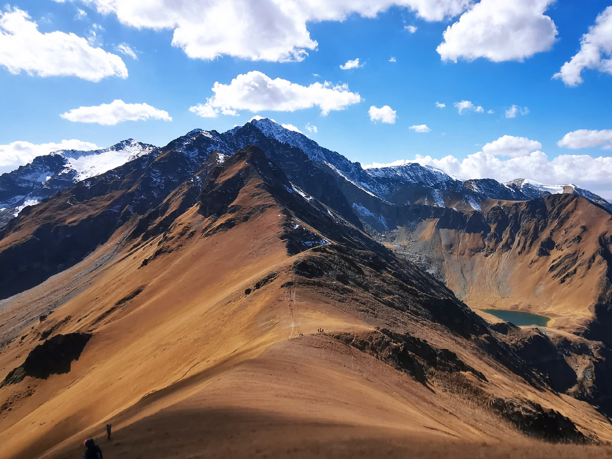 Поднявшись на перевал и далее на гребень, дух захватывает не только от высоты, но и от открывающейся панорамы: бесконечные хребты, белые шапки знакомых и незнакомых гор. В сторону Архыза на горизонте виднелась вершина горы Пшиш, в сторону Теберды ее трёхтысячники. Здесь сделали красивые фото, но долго задержатся не удалось. Октябрьская погода нас радовала солнечным днем, но с перевала нас сдувал ветер, как бы выгоняя с горы и давая понять, что погода скоро испортиться. Осень же.