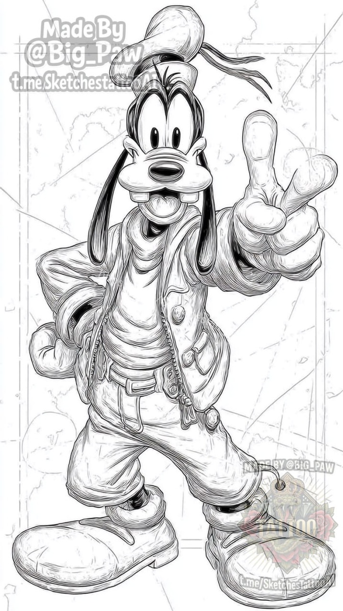 #2767 Подборка по запросу подписчика - собираю рукав из героев старых мультипликационных персонажей, хотелось бы еще добавить гуффи Фронтально, без фона 🧠 SYNTX - создай свой эскиз 💎 Информация - все услуги 💀 Эскизы от нейросети #гуффи #персонаж #мультики #эскиз #тату #татуировка